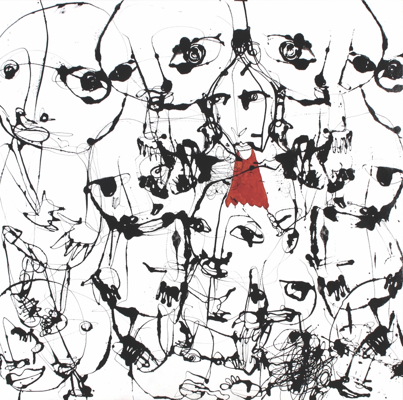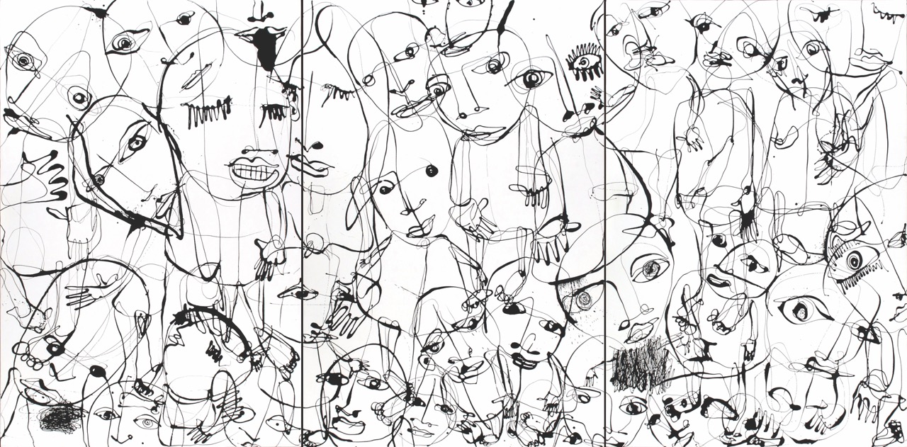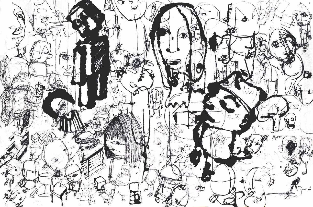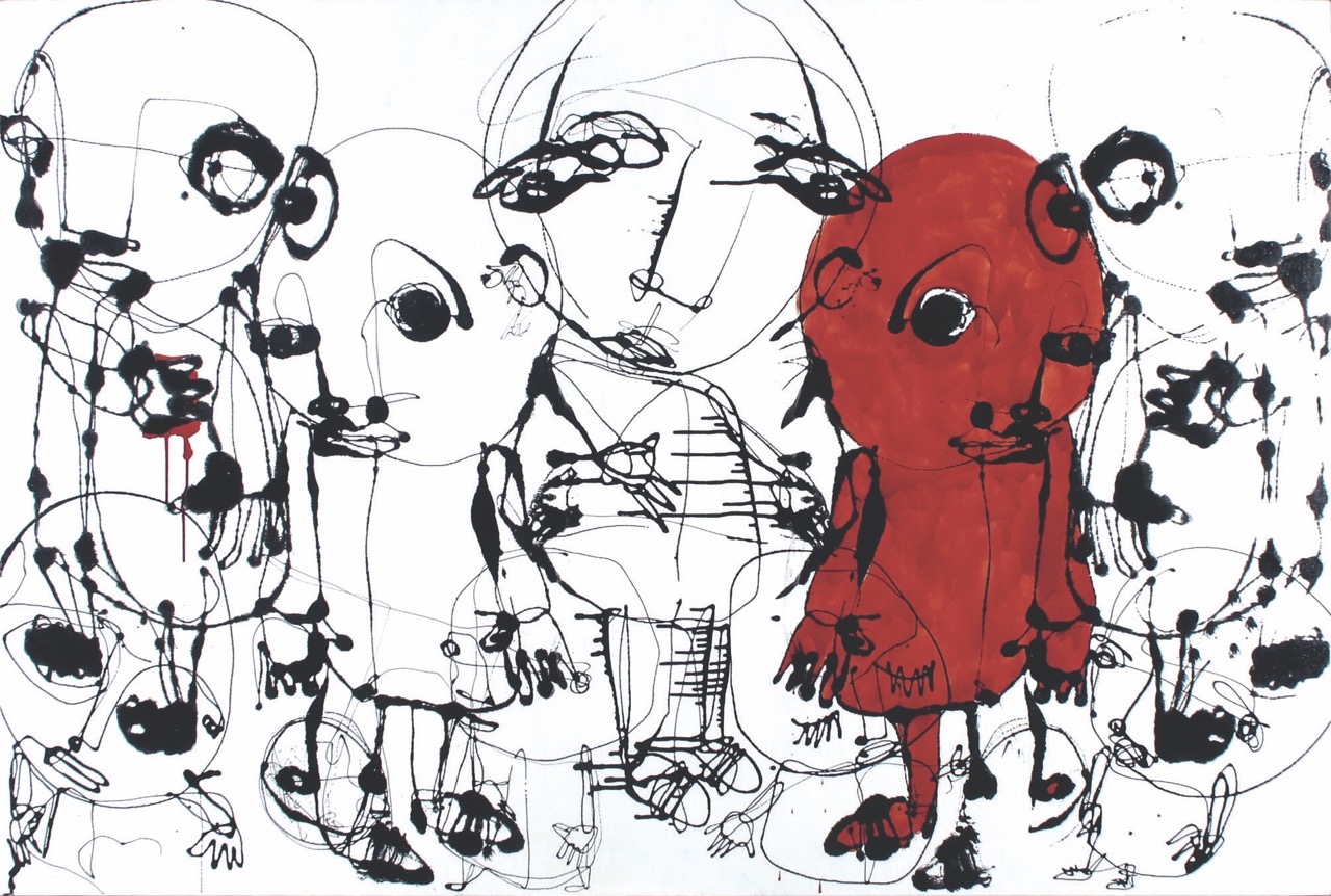 Bucchi’s Gesture is ruthless, in that it is born from the expressive modalities of a figuration created furiously, suddenly, and at the same time from a slow and meticulous process that always starts, like children’s drawings, from a circle (the head), to which the appendages are added in a continuous flow. All of this becomes expressed through fast drawing, characterized by a continuous line that is sure and steady, but also very synthetic, at times pushing towards a provocative infantilism-brutalism that gives rise to an immediate parallel with the work of Basquiat.Through particular actions, which come close to automatism, understood as an introspective journey, characterized by memory work and long sessions of imagination, the artist represents singular characters with heads that are oversized in relation to their bodies. They are creatures that are born from a gesture, and are directly thrust into the face of the spectator, not allowing them, however, to read or trace a story within them. The gazes lost in the void, full with waiting, the melancholy and sense of solitude that emerges from them creates a mood that both attracts and repels, that provokes both indifference and empathy, in the vision of these images that appear to come alive through a particular expressive intensity. They are characters that appear all the same, fun and inoffensive, similar to cartoons. In reality they are carriers of disorientating messages, they are anything but frivolous in that they express existential difficulty, the isolation of man in the encounter/battle with society. For Bucchi, the human figure is more than anything a presence, at times a shadow between the elusive and distorted scenographic perspectives, animated through a game of gazes between the subject and spectator. For this, the observer is forced to focus on the figures, as there is almost never any other revealing narrative element apart from the characters themselves, within a research of simplification and translation of mental states.Hence the speed of composition and the dynamic essence of the lines allow Bucchi to concentrate on the physiognomic expression, until they are transformed into a sort of physical and emotional caricature.