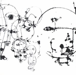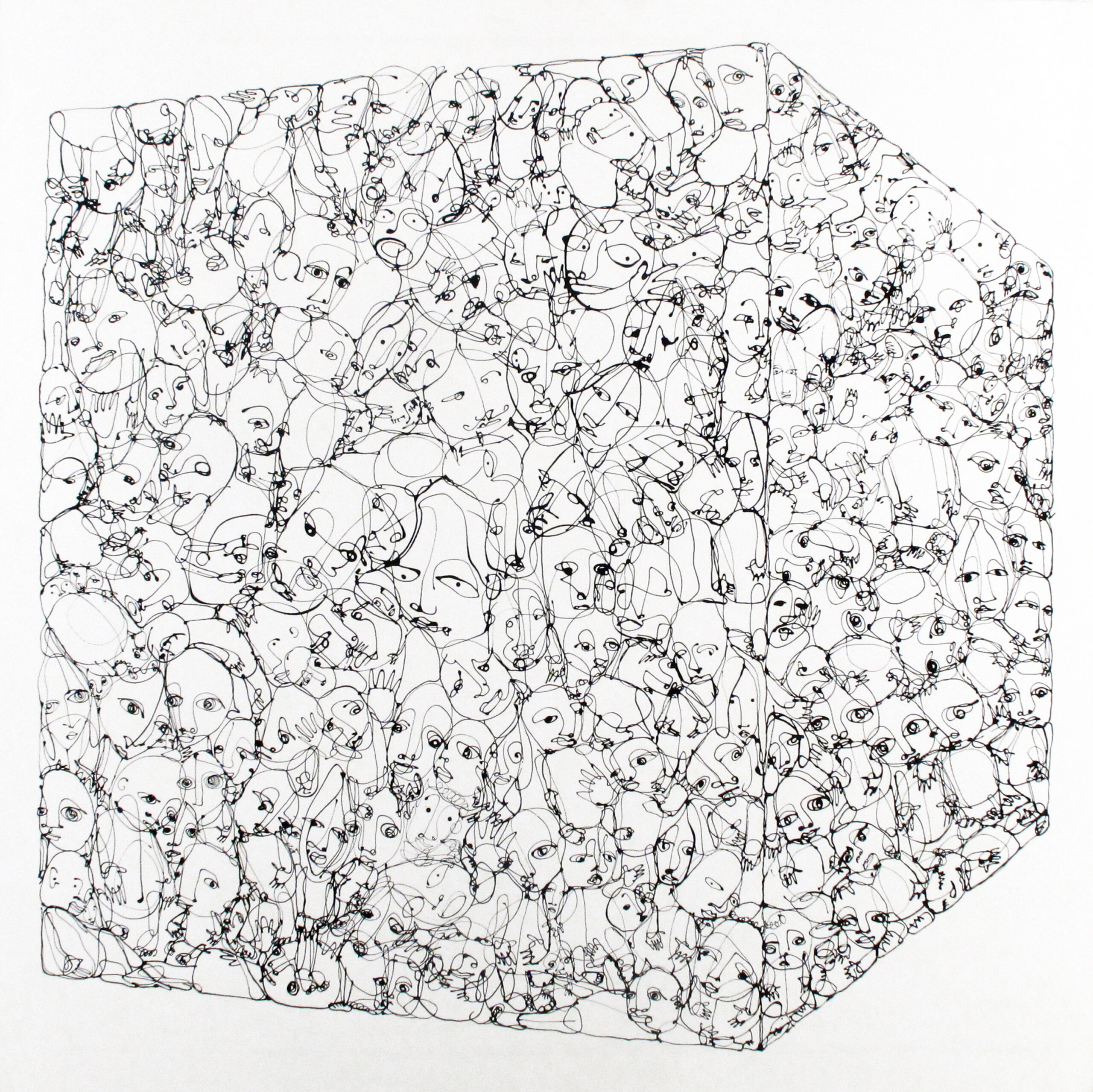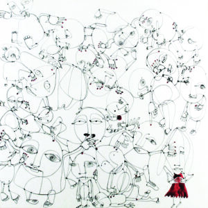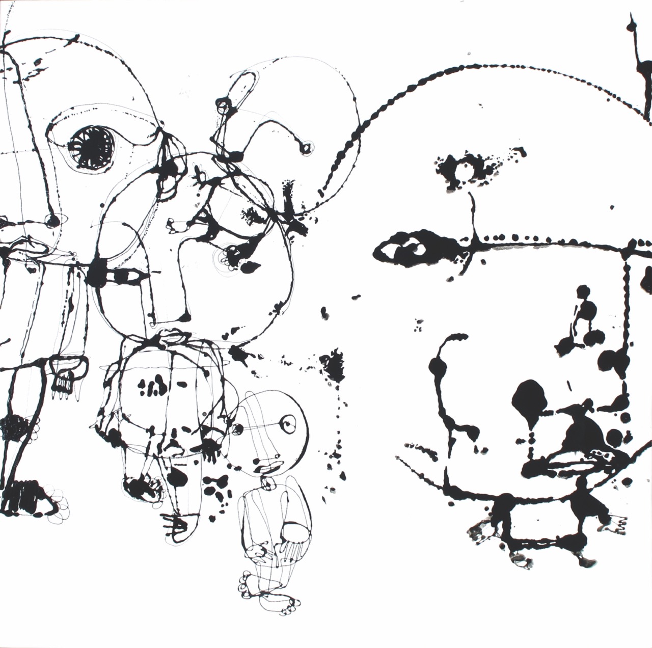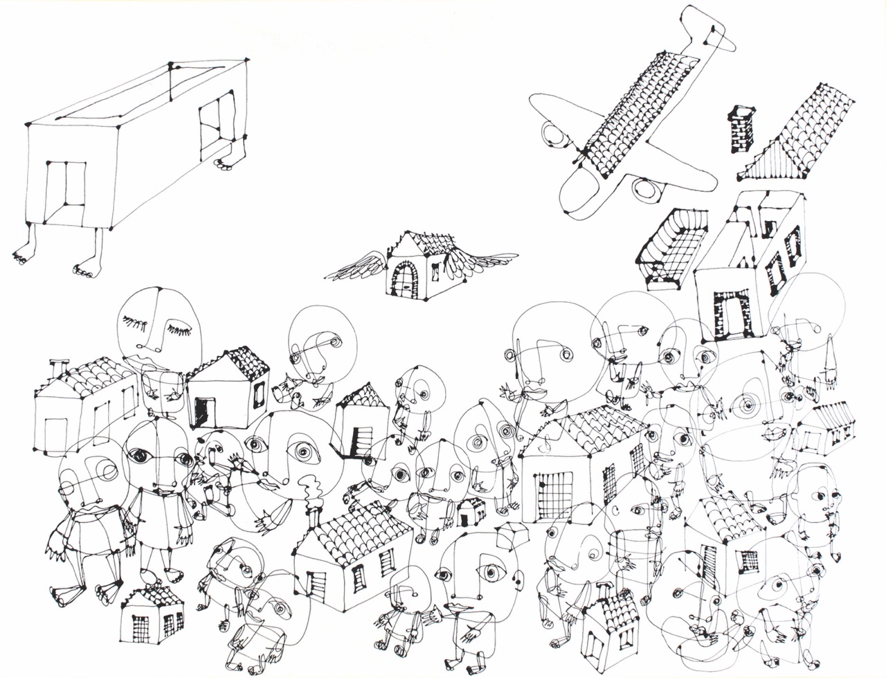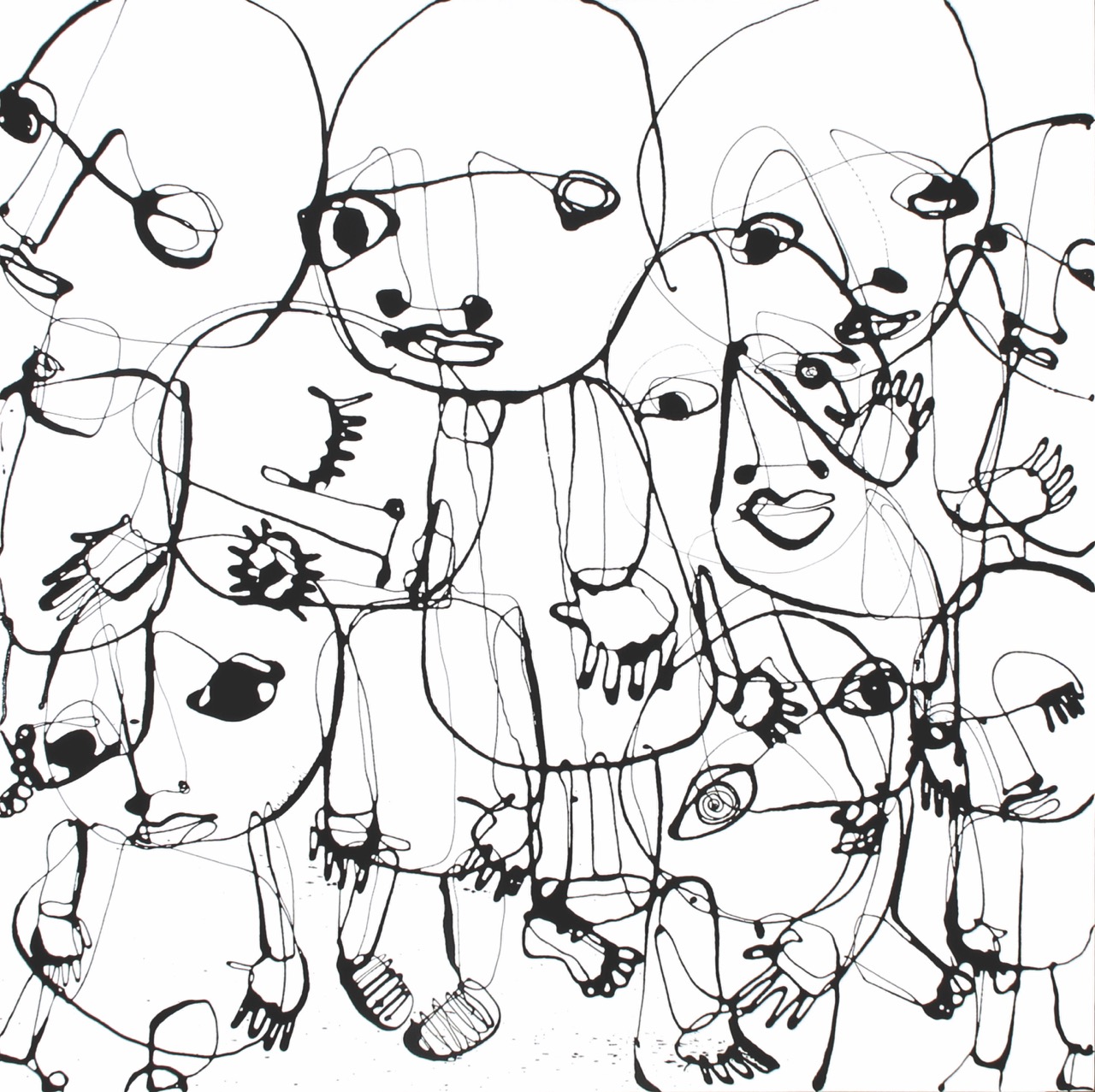 Bucchi’s Gesture is ruthless, in that it is born from the expressive modalities of a figuration created furiously, suddenly, and at the same time from a slow and meticulous process that always starts, like children’s drawings, from a circle (the head), to which the appendages are added in a continuous flow. All of this becomes expressed through fast drawing, characterized by a continuous line that is sure and steady, but also very synthetic, at times pushing towards a provocative infantilism-brutalism that gives rise to an immediate parallel with the work of Basquiat.Through particular actions, which come close to automatism, understood as an introspective journey, characterized by memory work and long sessions of imagination, the artist represents singular characters with heads that are oversized in relation to their bodies. They are creatures that are born from a gesture, and are directly thrust into the face of the spectator, not allowing them, however, to read or trace a story within them. The gazes lost in the void, full with waiting, the melancholy and sense of solitude that emerges from them creates a mood that both attracts and repels, that provokes both indifference and empathy, in the vision of these images that appear to come alive through a particular expressive intensity. They are characters that appear all the same, fun and inoffensive, similar to cartoons. In reality they are carriers of disorientating messages, they are anything but frivolous in that they express existential difficulty, the isolation of man in the encounter/battle with society. For Bucchi, the human figure is more than anything a presence, at times a shadow between the elusive and distorted scenographic perspectives, animated through a game of gazes between the subject and spectator. For this, the observer is forced to focus on the figures, as there is almost never any other revealing narrative element apart from the characters themselves, within a research of simplification and translation of mental states.Hence the speed of composition and the dynamic essence of the lines allow Bucchi to concentrate on the physiognomic expression, until they are transformed into a sort of physical and emotional caricature.