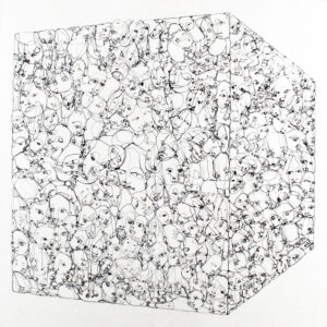 Since 2005, Danilo Bucchi has started to use the syringe as an extension of his arm. The artist fills it with paint and, depending on the energy with which he uses it, the black line emerges on the canvas, at times thin and at times full and substantial. In this way, synthesizing the gesture and the rarefaction of the sign that considers the line in relation to the spatiality.Why use the syringe instead of the brush? Bucchi himself answers this question in affirming that he believes that the brush is a tool of distraction in the moment in which one is forced to remove it from the canvas to load it with colour. And here, the reference to Jackson Pollock is almost obvious: not only for the artist’s method of working, who, despite being a “painter”, like the maestro of Action Painting uses neither an easel nor a palette; but also for the fact of both drawing images directly from their subconscious. His way of painting is a fast paced dialogue between his own interior world and the external reality. The pictorial material is in fact crossed by scratched and concentric lines, loaded with the immediateness and speed with which they are executed.All of this is tied to a strong need to return to painting, and it is for this exact reason that the artist, since 2007, has begun to also use charcoal, graphite, watercolours, oil and chalk.