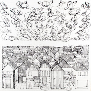 But it is with the colour, or rather its near absence, that Danilo Bucchi’s artistic research is explicated. Choosing black and white, only and exclusively black and white, with the addition, at times, of red, which tends to emphasize particular moments or symbols, underlining an emotion or a focal point of the representation. This is Danilo Bucchi’s choice, convinced that in the end colours are simply superfluous furnishings. And here it leads me to think of the great Sixteenth-Century dispute on whether to assign primacy to drawing (Florence, Michelangelo) or to colour (Venice, Titian). If Bucchi had lived in that century, there could have been no doubt over which position he would have taken.It being understood that it is not my intention to compare a contemporary artist to the great masters of the XVI Centrury, it is however interesting to note how Bucchi firmly places drawing above colour. This is probably because drawing, for Bucchi, is the best excuse to proceed between the meanders of sensations and behavioural facets. Through elemental forms that are easily distinguished in respect to the complexity of the issues that they represent, Danilo Bucchi loves to see something appear where previously there was only the white of the background. And this contrast can be seen best only if the drawing is black. Black on white, therefore, like writing, like the pages of a notebook.